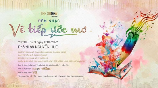 ĐÊM NHẠC THIẾU NHI – VẼ TIẾP ƯỚC MƠ là đêm nhạc mở màn cho chuỗi sự kiện Ngày Sách và Văn hoá Đọc Việt Nam tổ chức ngay trong lễ khai mạc ngày 19/4 với sự góp mặt của những ngôi sao nhí như Nhã Thy, Bella Vũ, Gia Khiêm, Bào Ngư, Gia Hân… Đây sẽ là đêm nhạc ý nghĩa với chủ đề hướng đến tương lai, ước mơ của thế hệ trẻ mà trong đó, rèn luyện thói quen đọc sách và tinh thần ham học hỏi được coi là chìa khoá đi đến thành công.