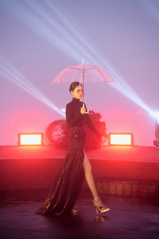 Mở màn show diễn, Á hậu 2 Miss Earth 2025 xuất hiện trong thiết kế đầm đen với phần thân trên ôm sát, tối giản mà sang trọng, tôn đường cong cơ thể và tạo cảm giác hiện đại. Phần chân váy tà dài có độ bắt sáng tinh tế, giúp người đẹp khéo khoe đôi chân thon dài và lối catwalk uyển chuyển hút mắt.