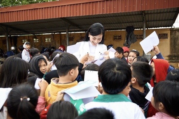 Tại đây, Hoàng Nhung không giấu được niềm vui và sự hạnh phúc khi được trở về trong vòng tay yêu thương của các em học sinh cũng như các thầy cô và ban giám hiệu nhà trường. Những khoảnh khắc Hoàng Nhung tươi cười rạng rỡ, nhiệt tình giao lưu, ký tặng và chụp hình cùng các em học sinh thể hiện rõ sự thân thiện, gần gũi, ấm áp và nhiều năng lượng của Á hậu Hoa hậu Hoàn vũ Việt Nam – Miss Cosmo Vietnam 2023.