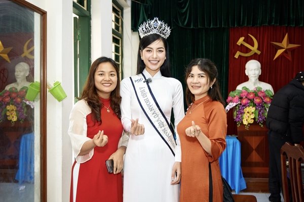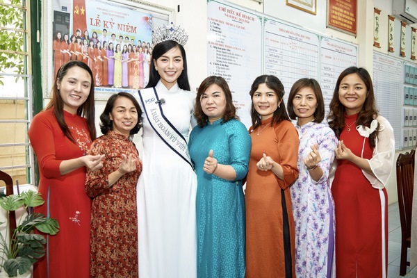 Không xuất hiện với hình ảnh lung linh, quyến rũ thường thấy, Hoàng Nhung lựa chọn áo dài truyền thống Việt Nam màu trắng trong ngày trở về quê hương. Địa điểm đầu tiên mà Hoàng Nhung ghé thăm đó chính là Trường Tiểu học Nghiêm Xuyên, nằm ở huyện Thường Tín, Thành phố Hà Nội. Đây chính là ngôi trường mà nàng hậu đã gắn bó và theo học lúc nhỏ.