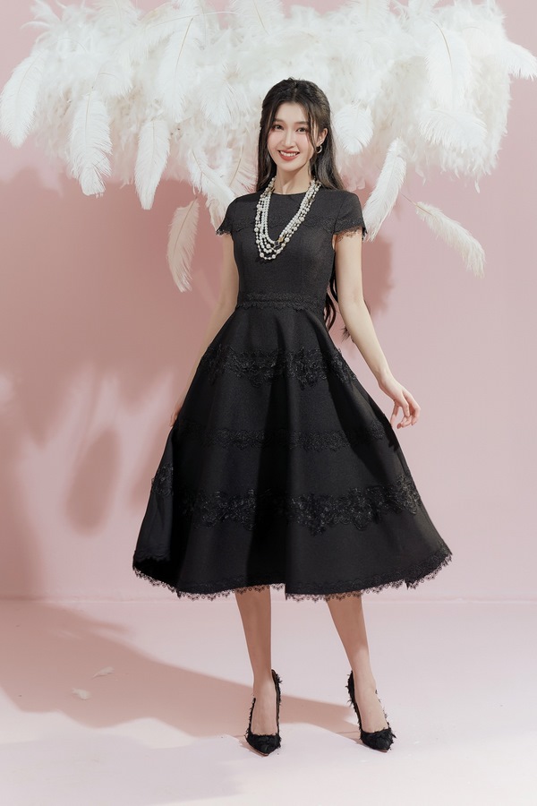 Vẫn với kỹ thuật hoa hồng cuộn nổi 3D được biến tấu trong muôn vàn sắc thái từ búp nở, e ấp, đến lúc từng cánh nở rộ rực rỡ với đa dạng chất liệu cao cấp từ gấm, nhung, ren và lụa… Thông qua những thiết kế này, Phương Nhi trở thành tâm điểm ánh nhìn, ngọt ngào nhưng cũng đầy kiêu kỳ.