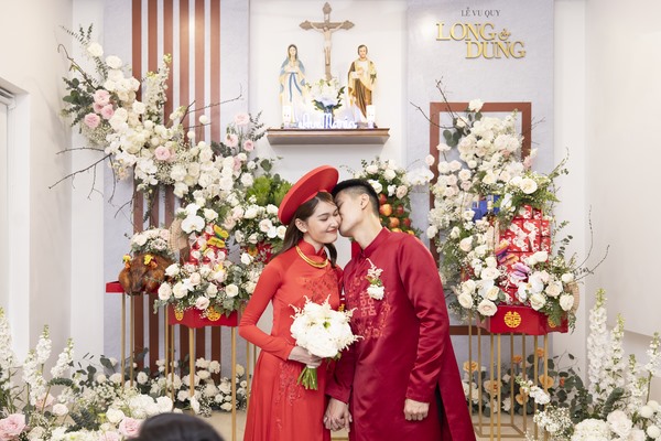 Đúng 9 giờ, nhà trai đến với tâm trạng phấn khởi. Chú rể luôn cười hạnh phúc vì sắp đón được người thương về “dinh”. Lần đầu lộ diện, visual chồng doanh nhân của Thùy Dung khiến dân tình trầm trồ, không ngớt lời khen á hậu và chồng xứng đôi. Hai nhan sắc này đứng cạnh nhau cũng khiến người người xiêu lòng. Hai người làm lễ trong sự chúc mừng của gia đình hai bên, bạn bè vì một tình yêu đẹp, đến với nhau bằng sự chân thành.