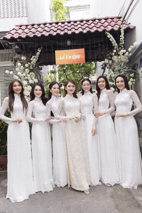 Đặc biệt, đám cưới đầu tiên của tháng 12 còn có dàn phù dâu ngập tràn visual: Minh Tú, Khánh Vân, Quỳnh Châu, Thuỷ Tiên, Huỳnh Thuý Vi, Hoàng Mỹ An. Những hoa hậu, á hậu, siêu mẫu, người đẹp xuất hiện trong tà áo dài trắng, nét mặt tươi tắn, thu hút nhiều ánh nhìn.