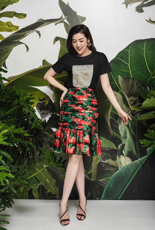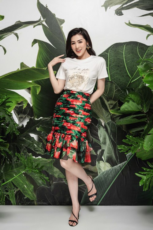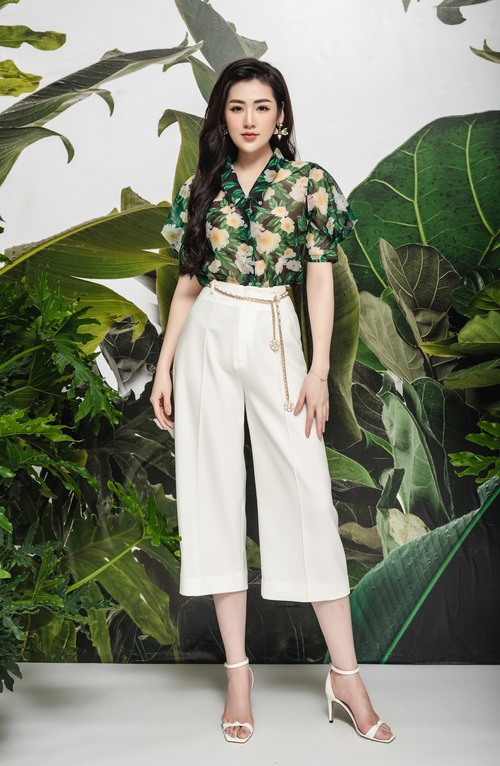 Chọn những thiết kế cho mùa Hè, Tú Anh luôn ưu tiên chọn áo croptop với phần xếp nếp ấn tượng ở ngực, phần tay bèo duyên dáng như chính loài hoa trà. Bên cạnh đó thì sự kết hợp của quần ống rộng kèm với áo với họa tiết hoa trà, nhẹ nhàng thanh thoát cũng khiến cô dành nhiều sự quan tâm.