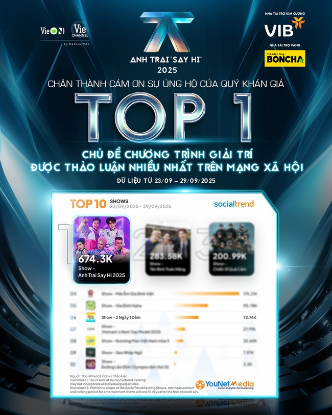 Chỉ mới đi qua 2 tập phát sóng, Anh Trai “Say Hi” 2025 đã khẳng định vị thế của chương trình giải trí hàng đầu tại Việt Nam. Thành tích rực rỡ của tập 2 không chỉ đến từ sự đồng hành của người hâm mộ, mà còn đánh dấu bước tiến quan trọng, đưa nhạc Việt vươn tầm quốc tế. Và đó cũng chính là tiền đề để các tập phát sóng tiếp theo tiếp tục mang đến những trải nghiệm bùng nổ, hứa hẹn mở ra thêm nhiều cột mốc đáng nhớ cho cả chương trình nói riêng và thị trường giải trí Việt Nam nói chung.