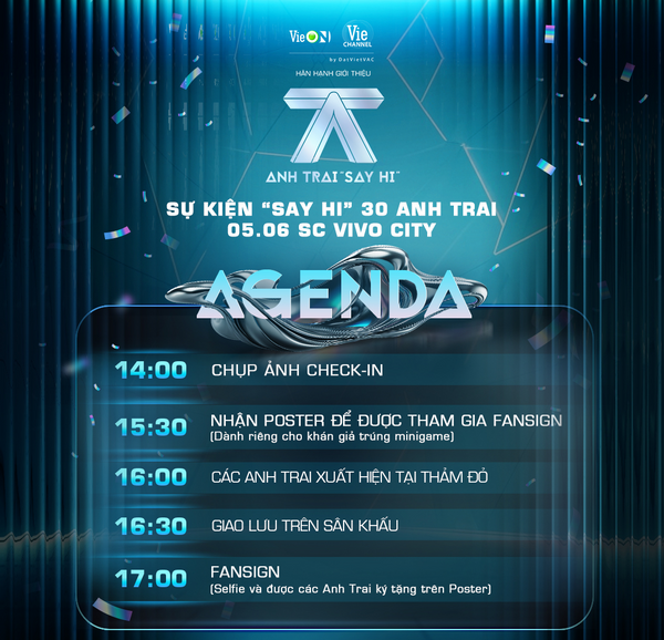 Vừa qua, fanpage Anh Trai “Say Hi” đã chính thức công bố Sự kiện “Say Hi” sẽ diễn ra vào ngày 05/06, với loạt hoạt động chấn động dành cho người hâm mộ như giao lưu, ký tặng… Lần đầu tiên, 30 Anh Trai chính thức “say hi” với những khán giả đã ủng hộ và yêu mến chương trình trong suốt thời gian trước khi chương trình lên sóng.