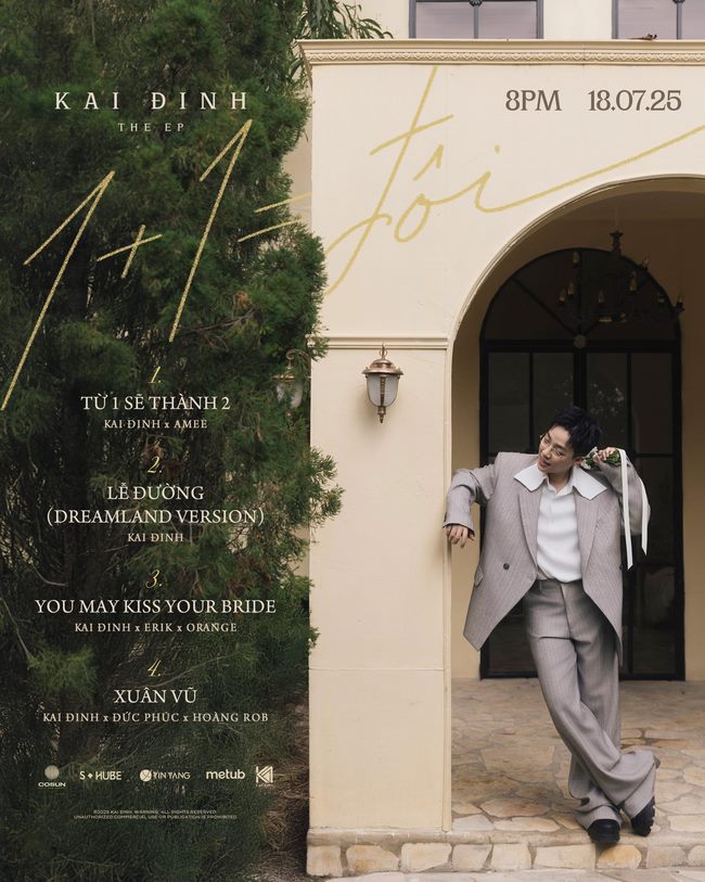 Mới đây, Kai Đinh đã chính thức phát hành EP ‘1+1 = đôi’ và MV You May Kiss Your Bride. EP mới của Kai Đinh bao gồm 4 ca khúc đều lấy chủ đề về đám cưới, kết hợp với các giọng ca đình đám của Vpop: ‘từ 1 sẽ thành 2’ – AMEE, Lễ Đường (dreamland version), ‘you may kiss your bride’ – ERIK và Orange, ‘xuân vũ’ – Đức Phúc.