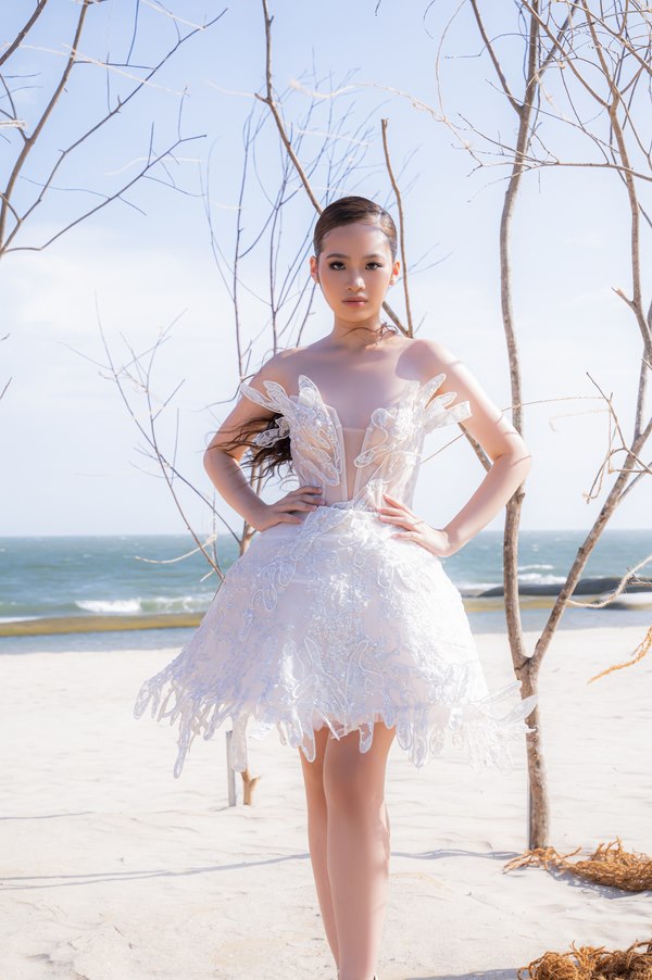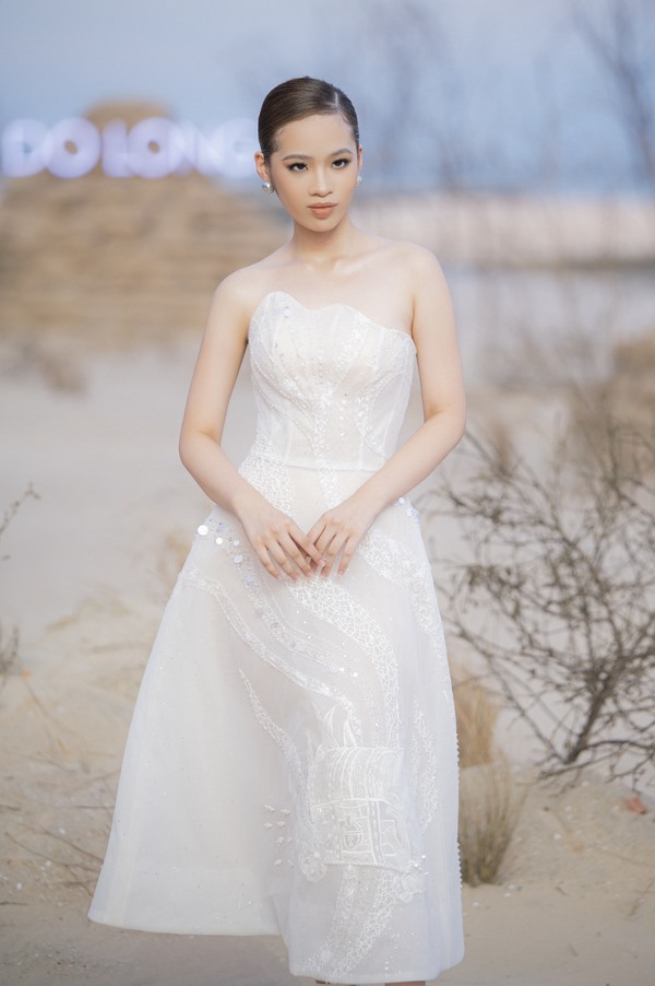 Với thiết kế đầu tiên, Bảo Hà diện chiếc váy tone trắng cúp ngực lấy phần họa tiết sóng vỗ được đính kết tỉ mỉ trên thân váy làm điểm nhấn. Thần thái lạnh lùng chuẩn model quốc tế đã khiến không ít khán giả phải xuýt xoa. Đặc biệt, Bảo Hà phải thực hiện màn trình diễn của mình lúc trời chiều với thời tiết nhiều gió, Quán quân Teen Models 2022 đã rất bình tĩnh xử lý tình huống với những bước chân uyển chuyển, chuyên nghiệp và vững vàng để mang đến màn trình diễn trọn vẹn nhất.