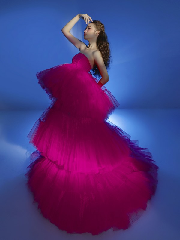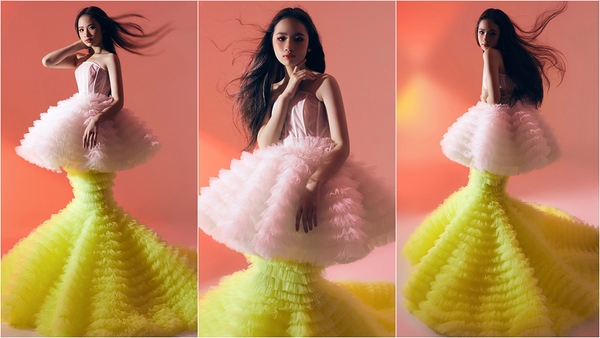 Biến hóa đa dạng và đầy năng lượng trong các mẫu trang phục của NTK Nguyễn Minh Công, Bảo Hà thể hiện khả năng tạo dáng chuyên nghiệp, thần thái cuốn hút khi khoác lên mình những mẫu thiết xếp tầng đồ sộ.