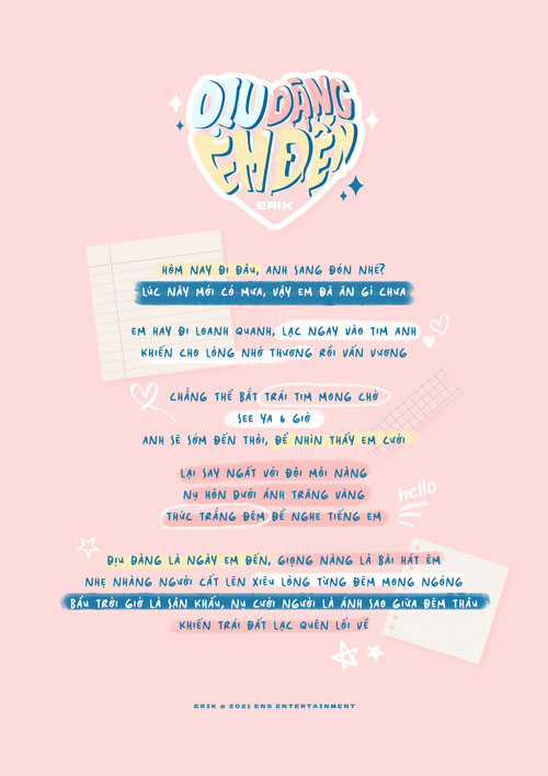 Bên cạnh đó, poster Dịu dàng em đến cũng gây ấn tượng mạnh khi Erik thay đổi màu tóc liên tục. Giọng ca 9X bày tỏ bản thân không ngại “biến hóa” liên tục để tạo niềm vui cho những khán giả yêu thương anh trong mùa dịch bệnh căng thẳng này.