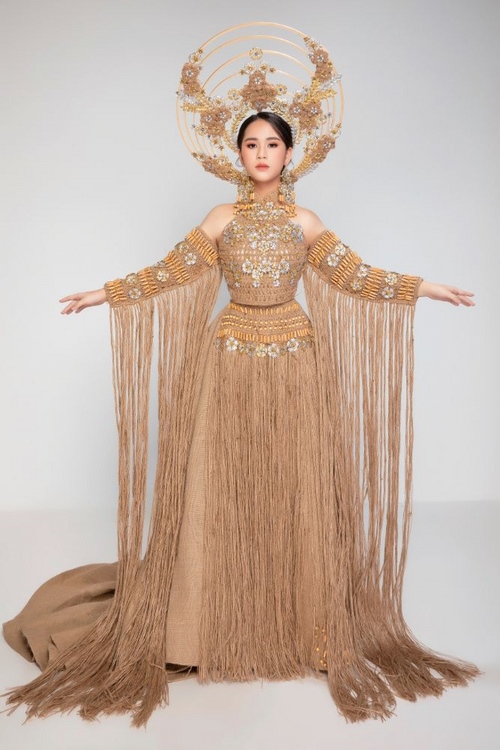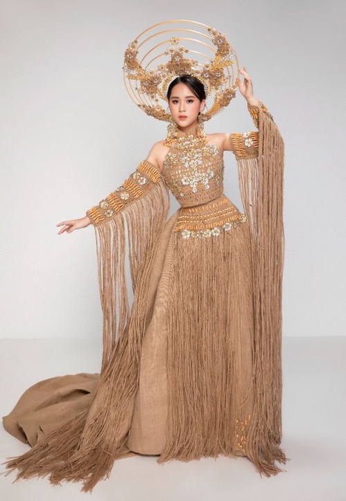 Trang phục còn được đính kết bằng những cánh hoa kim loại được xi mạ bằng những tông màu vàng và bạc như thông điệp mong ước “Việt Nam- Rừng vàng biển bạc”, kết hợp với những hạt đá pha lê lấp lánh làm nổi bật giữa nền đay dung dị, tự nhiên và nền nã …