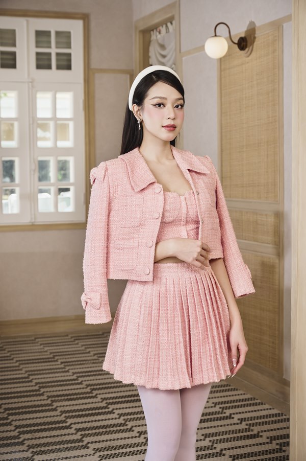 Bộ sưu tập lấy chất liệu tweed làm chủ đạo. Đây là chất liệu đặc trưng của phong cách Pháp với các ưu điểm ấm áp, sang trọng, cổ điển và không bao giờ lỗi mốt. Quen thuộc trong thời trang hàng chục năm nay, tweed trên trang phục của Lê Ngọc Lâm mới mẻ hơn thông qua những phom dáng như áo khoác lửng, bra top hay chân váy xếp ly, đầm cúp ngực, phù hợp với những cô gái hiện đại.