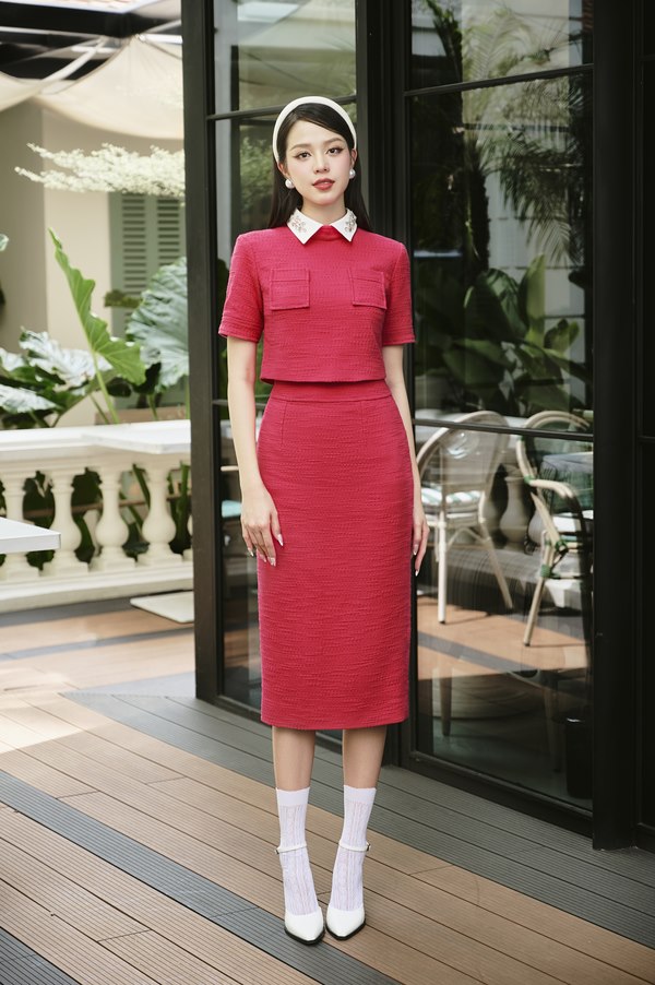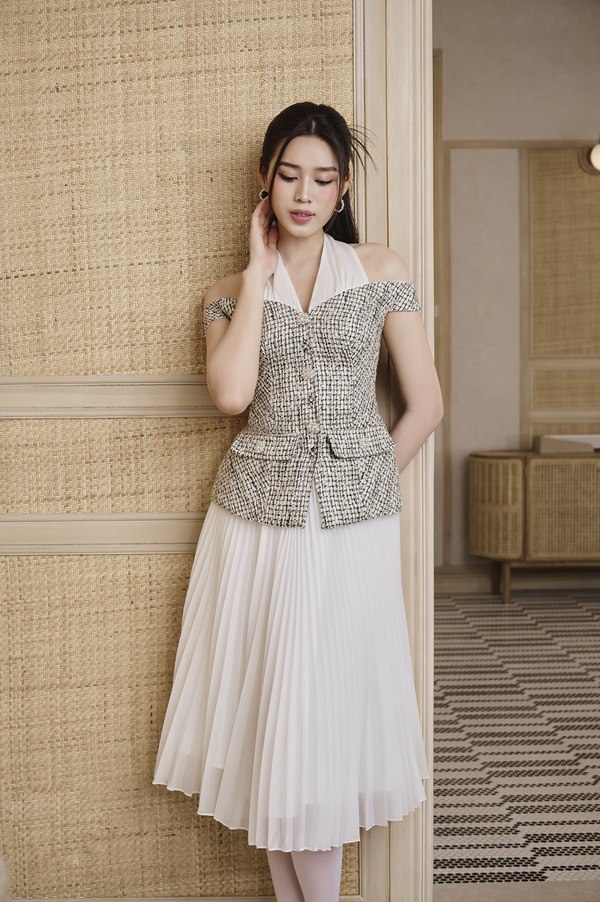 Vẻ đẹp ngọt ngào, trang nhã của Đỗ Thị Hà và Thanh Thủy được khoe trọn qua những mẫu trang phục tweed đa phong cách, ứng dụng được trong nhiều hoàn cảnh từ đi làm, dạo phố đến đi tiệc, gặp mặt hay chúc tụng đầu xuân. Chất liệu chiffon và organza được nhà thiết kế đan xen trên những mẫu sơ mi nơ cổ, đầm xòe bồng, chân váy chữ A để tạo nên sự mềm mại, nữ tính.