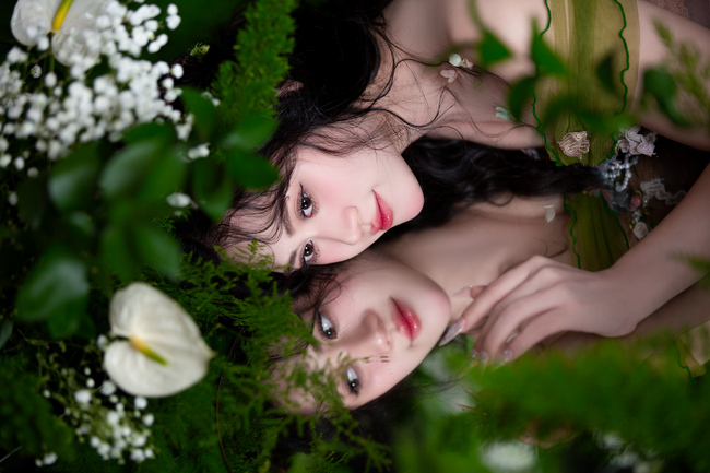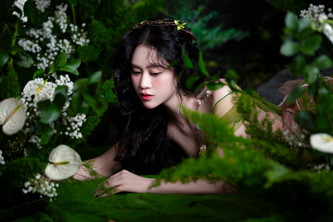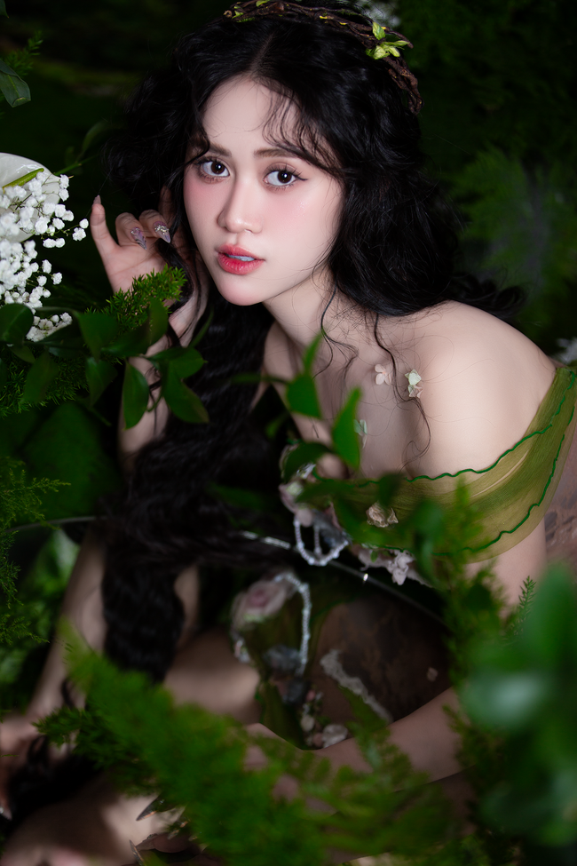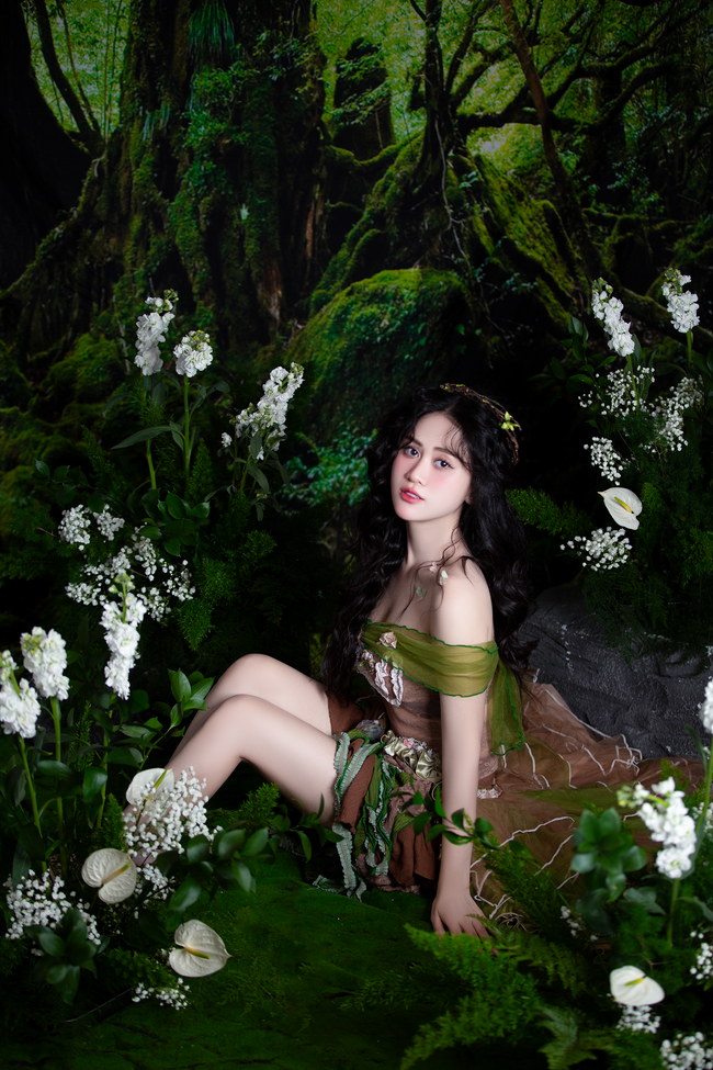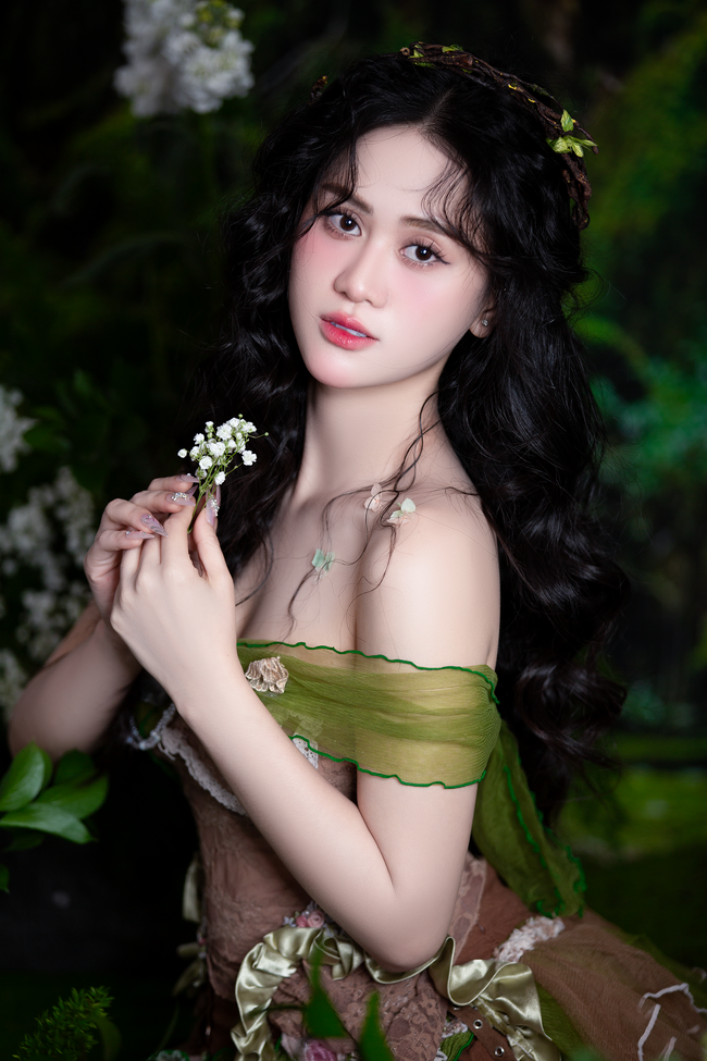 Ở concept thứ hai, Jee Trần hóa thân thành một nàng tiên giữa khu rừng cổ tích, với trang phục mang sắc xanh nâu thiên nhiên điểm xuyết các họa tiết lá và hoa tỉ mỉ. Jee Trần như một nàng tiên rừng bước ra từ những trang truyện thần thoại. Từng góc nghiêng, ánh mắt và dáng pose đều toát lên sự huyền bí, gợi cảm nhưng thanh tao, khiến người xem không thể rời mắt.
