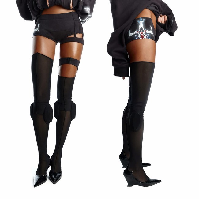 Thiết kế thứ 3 là chiếc quần mini pants trong bộ sưu tập mới nhất của thương hiệu mang tên Feng System Resort 24. Thiết kế đen tuyền ôm sát người, được nhấn nhá bằng phần cắt xẻ độc đáo tôn lên vẻ đẹp của đôi chân nữ thần tượng nhóm BlackPink.