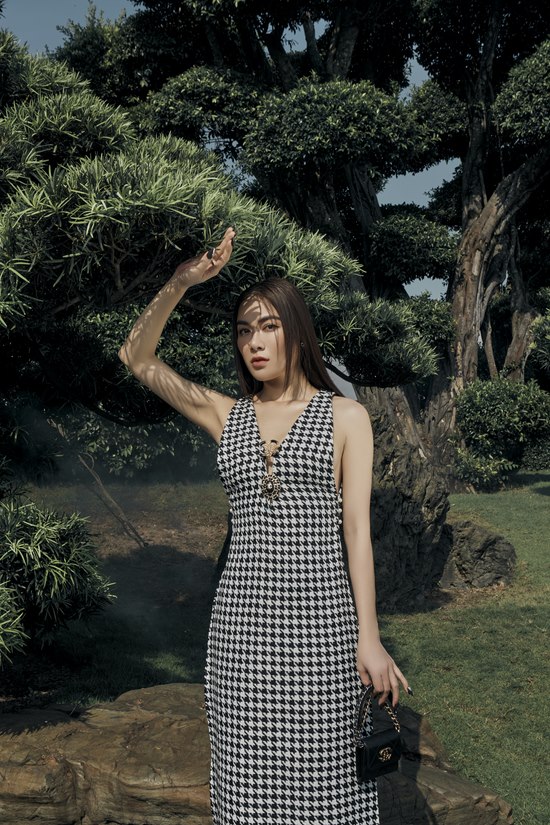 Sang kiểu áo dài sát nách suông cổ áo chữ V, Tuyết Nga một lần nữa chứng minh cô có thể “cân” được mọi kiểu áo dài. Lối trang điểm và kiểu tóc xõa tự nhiên, với màu áo ca rô trắng đen kết hợp cùng phụ kiện túi đeo chéo mini đem đến cho cô vẻ đẹp năng động hiện đại lôi cuốn.