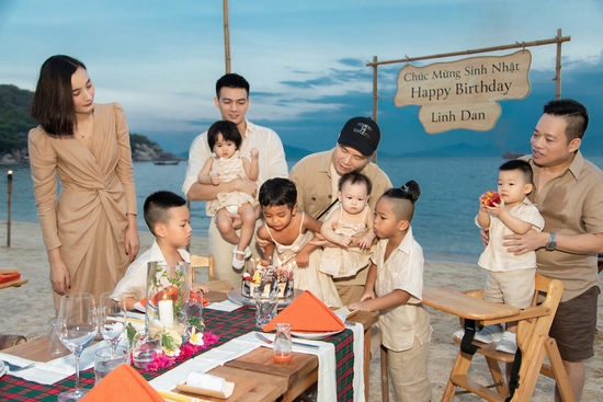 Tại buổi tiệc, các con của NTK họ Đỗ đều được diện trang phục đồng điệu với tông màu be ngọt ngào trên nền chất liệu linen. Trong đó, Linh Đan, Hà My và Én diện váy xoè rộng với chi tiết nơ làm điểm nhấn. Nhím, Tít và Gấu mặc áo sơ mi ngắn tay kết hợp quần short.