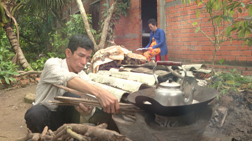 Được biết, chị Ơn – vợ anh Trung – đã mang trong người căn bệnh ung thư vú giai đoạn cuối gần 2 năm nay, dù đã vay rất nhiều tiền để làm phẫu thuật nhưng hiện nay chị còn phải tiến hành hóa trị theo chỉ định của bác sĩ. Thấy chi phí chạy chữa quá tốn kém, gia đình bây giờ đang lâm vào cảnh nợ nần khắp nơi nên đã có đôi lần chị Ơn muốn dừng điều trị. Thương vợ nên anh Trung không chỉ là chỗ dựa tinh thần an ủi vợ mà anh còn cố hết sức làm lụng để chị Ơn an tâm trị bệnh. Với nghề hái chôm chôm mướn bao năm nay, anh Trung hết làm gần nhà rồi lại bôn ba lên tận Đồng Nai kiếm sống. “Trừ lúc mình đau bệnh mới sợ còn mình hổng có đau bệnh thì ráng cố gắng, cực cỡ nào cũng làm…”. Nghe lời tâm sự của anh Trung, chúng tôi càng thấy rõ quyết tâm của một người chồng luôn cố gắng vì vợ, dẫu cực khổ đến đâu đi chăng nữa anh cũng sẽ cố gắng tìm lại sức khỏe cho vợ.