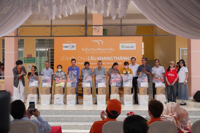 Đồng hành cùng Quỹ Nam Phương, trong buổi lễ khởi công cầu Khang Thành An, Công ty Minh Long 1, Công ty Cổ phần Sản xuất nhựa Duy Tân, Công ty Sữa Đậu Nành Việt Nam – VinaSoy, Công ty Bánh Kẹo Mayora Việt Nam & các nhà hảo tâm Quỹ Nam Phương trao tặng 20 phần quà cho các em học sinh đạt thành tích xuất sắc trong học tập và 50 phần quà cho các hộ gia đình có hoàn cảnh khó khăn tại địa phương