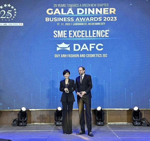 Vừa qua, Công ty Thời Trang và Mỹ Phẩm Duy Anh – DAFC tiếp tục ghi danh bảng vàng dưới sự điều hành của CEO Tiên Nguyễn với danh hiệu “SME Excellence” năm 2023 do Eurocham – Hiệp hội doanh nghiệp châu Âu trao tặng.