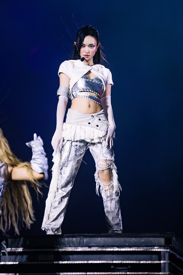 Ngay sau đó, Châu Bùi nhanh chóng chuyển sang nhịp điệu sôi động với “AAA” – ca khúc từng đạt Top 1 thịnh hành trên nền tảng trực tuyến. Lần đầu trình diễn trực tiếp, cô mang đến năng lượng trẻ trung, vũ đạo dứt khoát cùng sự tự tin mới mẻ trên sân khấu lớn.