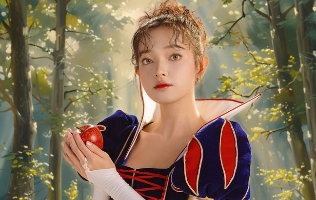 Ấn tượng hơn cả vẫn là những tấm ảnh khi Châu Bùi hóa thân thành Bạch Tuyết với trái táo độc trên tay. Không chỉ hồn nhiên, thánh thiện, trên gương mặt xinh đẹp của nàng lúc này là một ánh mắt đầy quyết tâm, mạnh mẽ. Sự thay đổi này cũng là tinh thần của Bạch Tuyết trong phiên bản mới: không chỉ là một nàng công chúa xinh đẹp cần hoàng tử giải cứu, mà đầy dũng cảm, muốn tự viết nên câu chuyện của đời mình khi dám đương đầu với ách thống trị của Hoàng hậu độc ác.