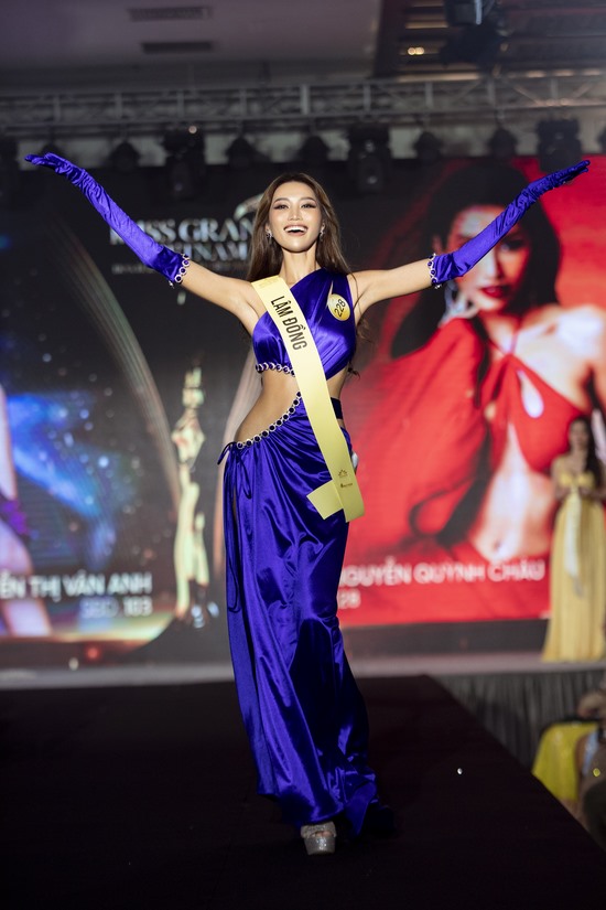 Xuất hiện tại buổi họp báo, Chế Nguyễn Quỳnh Châu thu hút mọi ánh nhìn khi diện bộ cánh màu xanh được cắt xẻ vô cùng táo bạo, khoe trọn những đường cong quyến rũ trên cơ thể. Có thể nói mỗi lần xuất hiện tại Miss Grand Vietnam, Quỳnh Châu đều biết cách mang đến rất nhiều điều mới mẻ cho bản thân khiến các fan sắc đẹp đặt nhiều sự kỳ vọng dành cho cô nàng.