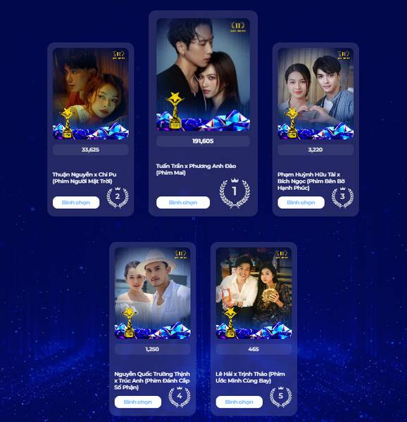 Cuộc giao tranh nảy lửa giành chiếc cúp ‘Nữ diễn viên được yêu thích nhất’ giữa những mỹ nhân đình đám của truyền hình Việt chưa bao giờ hết hot. Bỏ xa các đề cử còn lại, Hạ Anh (vai Kim Anh – phim Người thầm lặng) vẫn là cái tên giữ vị trí số 3 liên tiếp 3 tuần qua với 35.400 điểm. Xếp thứ 2 là Bích Ngọc (vai Nhã Phương – phim Bên bờ hạnh phúc) với 13.595 điểm, riêng vị trí số 3 đã có sự thay đổi khi Lê Phương (vai Lữ Hồng – phim Bí mật của luật sư) nhanh chóng bứt phá vượt qua Yeye Nhật Hạ với 1.870 điểm để lọt vào top 3. Trong khi đó, top 3 bảng xếp hạng ‘Nam diễn viên được yêu thích nhất’ ghi nhận số vote tăng vọt tuy vị trí dẫn đầu vẫn không thay đổi là Triệu An dẫn đầu với 186.395 điểm, nhưng xếp thứ 2 đã là Hữu Tài vươn lên với 80.975 điểm, Anh Tài tụt xuống hạng 3 với 33.225 điểm.