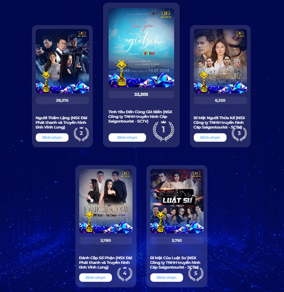 Ở lĩnh vực Truyền hình, những điểm số cao ấn tượng tiếp tục được thiết lập, tuy nhiên top 3 tạm dẫn đầu dường như không có sự thay đổi lớn. Tại bảng xếp hạng ‘Phim Việt Nam được yêu thích nhất’ dẫn đầu vẫn đang là Tình Yêu Đến Cùng Gió Biển với 33.205 điểm. Theo sát phía sau là Người Thầm Lặng – 28.375 điểm và Bí Mật Người Thừa Kế chính thức vươn lên xếp thứ 3 với 6.220 điểm, còn Đánh Cắp Số Phận ngậm ngùi ‘rơi’ xuống hạng 4.