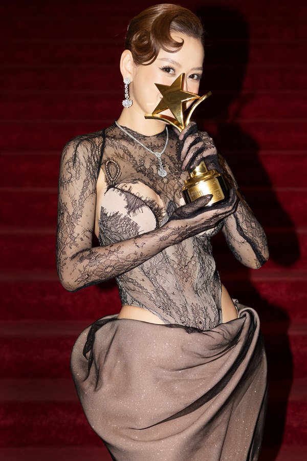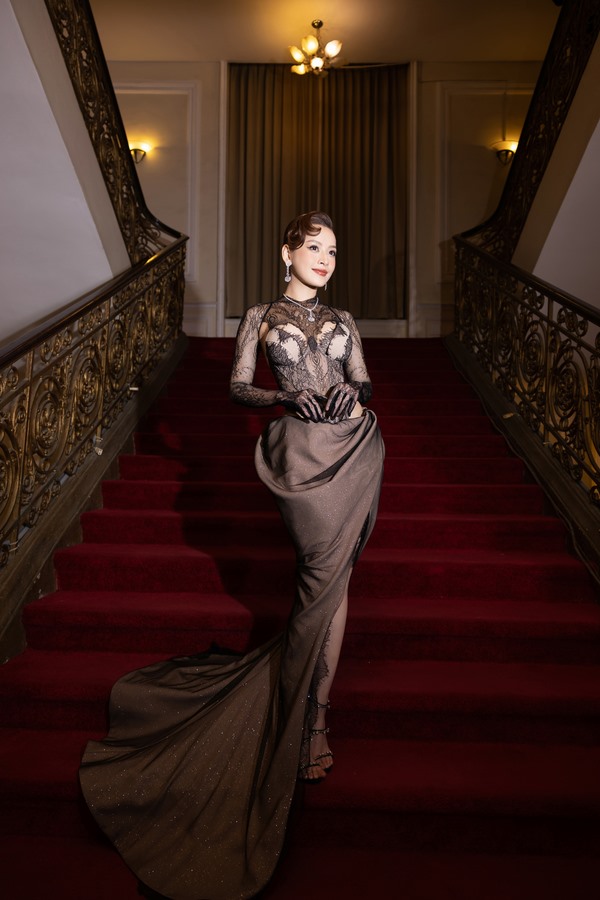 Nữ diễn viên diện chiếc váy ren lộng lẫy, quyến rũ của NTK Nguyễn Tiến Truyển kết hợp cùng kiểu tóc, cách makeup mang phong cách cổ điển, bộ trang sức lấp lánh tạo nên một tổng thể ấn tượng, thu hút mọi ánh nhìn trên thảm đỏ.