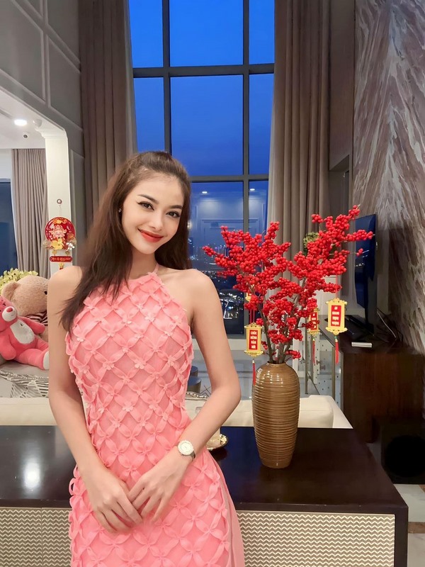 Á hậu Ngọc Hằng “đụng độ” Phương Anh cùng mẫu áo. Tuy nhiên cô chọn gam màu đỏ nổi bật, phù hợp với không khí Tết đến xuân về.
