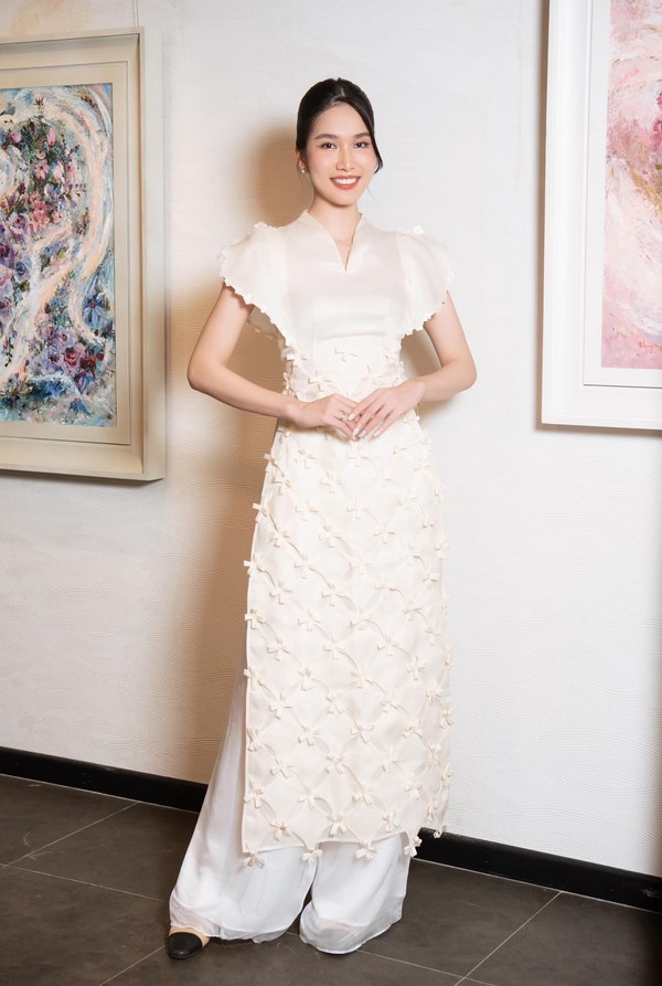 Ngoài thiết kế đính nơ đang “cháy hàng”, nhiều mẫu áo dài Lê Ngọc Lâm cũng được các mỹ nhân Việt khác yêu thích. Á hậu Phương Anh duyên dáng cùng chiếc áo cách tân cổ V, tay chờm, có tông màu trắng kem tinh khôi. Thân áo cũng được sử dụng kỹ thuật đặc biệt để kết nơ nhỏ xinh tạo điểm nhấn.