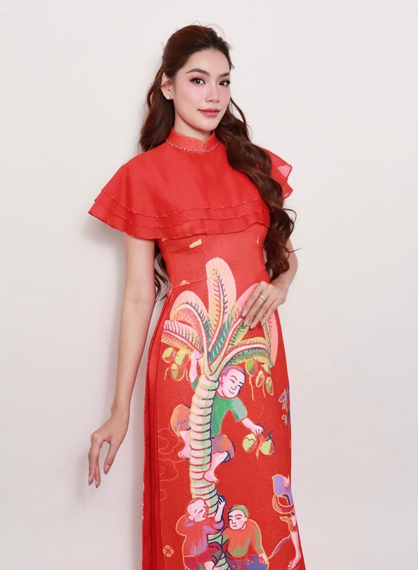 Hoa hậu Lê Hoàng Phương khoe nét đẹp dịu dàng cùng thiết kế sử dụng chất liệu gấm hoa cao cấp với sắc đỏ chủ đạo, kết hợp chất liệu organza mềm mại. Trên tà áo, Lê Ngọc Lâm ứng dụng kỹ thuật in cao cấp họa tiết tranh Đông Hồ, tái hiện đời sống dân gian những ngày năm mới.