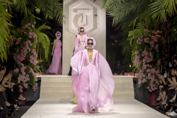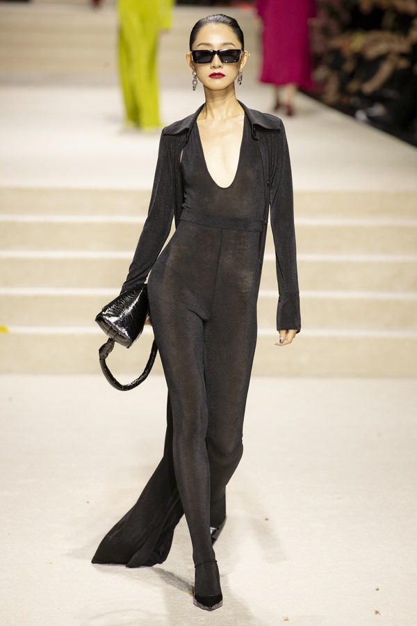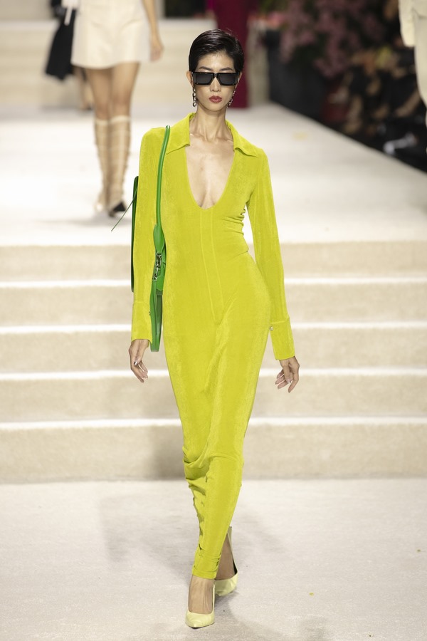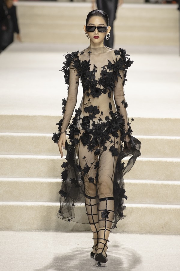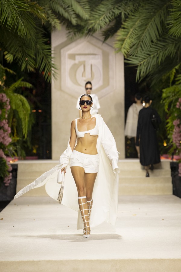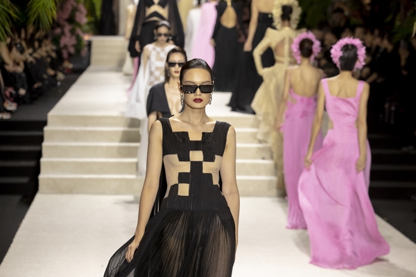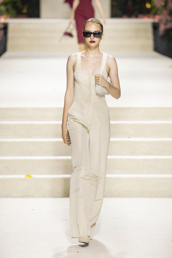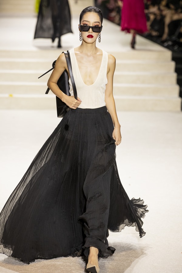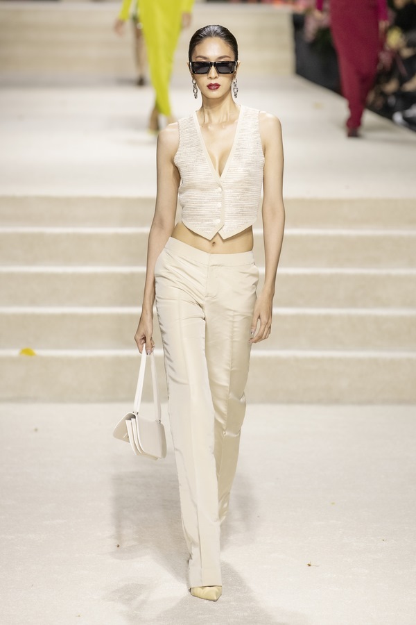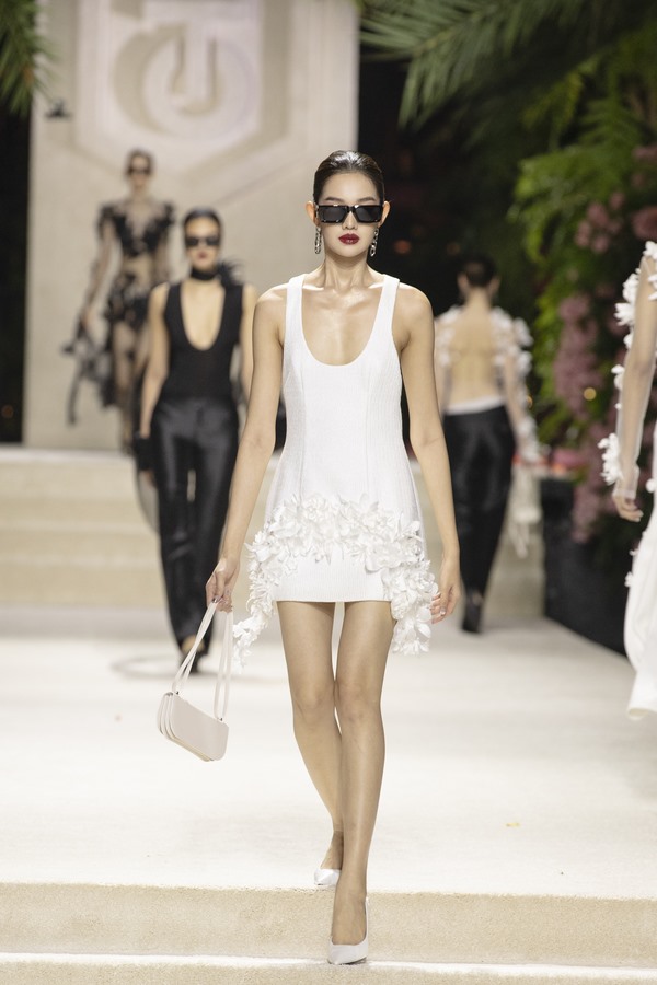 Show diễn mở màn với những gam màu sự hòa hợp giữa thời trang cao cấp lẫn tính ứng dụng như: đen, trắng hay beige,… trong một loạt các thiết kế mang hơi hướng hiện đại, làm nổi bật bản lĩnh mạnh mẽ, không khoan nhượng của một quý cô thế kỷ 21. Trong đó, phom dáng “chiếm sóng” nhiều nhất chính là các mẫu áo croptop cùng mini dress, tưởng chừng như thoải mái nhưng lại táo bạo bất ngờ với đường cắt xẻ khu chân ngực. Hình ảnh những chiếc áo quần xuyên thấu mỏng tang, short ngắn kết hoa 3D hay chiếc áo quá khổ và những chiếc quần dài cạp trễ mang đậm tinh thần quyết liệt, gợi cảm tột cùng nhưng vẫn phảng phất nét trang nhã trong mỗi DNA thương hiệu.