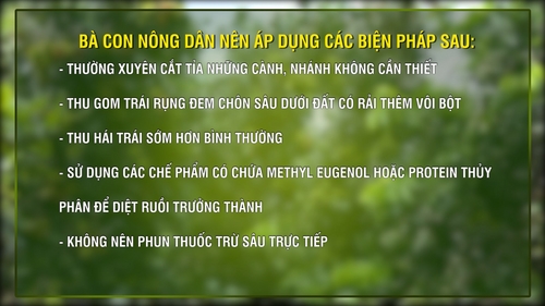 • Thu gom trái rụng đem chôn sâu dưới đất có rải thêm vôi bột để tiêu diệt hết trứng và dòi non còn nằm bên trong trái.