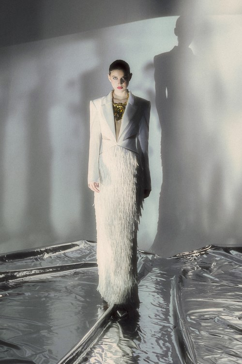 Thông qua cách kết hợp khéo léo giữa phom áo blazer cùng chân váy trụ đính kim sa, mẫu thiết kế số 39 thể hiện sự hoà hợp giữa vẻ đẹp mạnh mẽ cùng nét bay bổng nữ tính của người phụ nữ hiện đại.