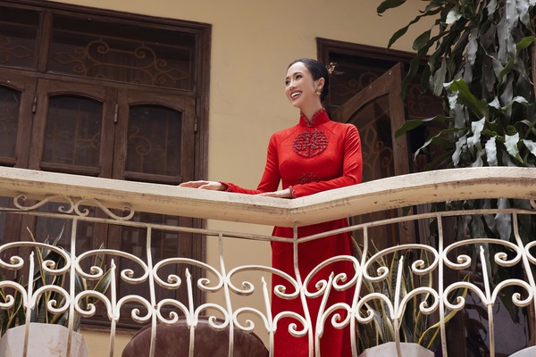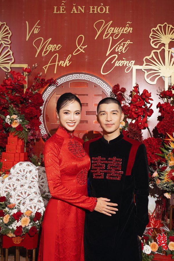 Cô dâu cũng thức dậy từ sớm để trang điểm và chuẩn bị trang phục để đón nhà trai. Trong lễ ăn hỏi, cả hai lựa chọn áo dài truyền thống do bộ đôi NTK áo dài Song Toàn thực hiện, với hình ảnh chữ Hỉ thêu trước ngực, trong không gian trang trí ngập tràn hoa tươi với sắc đỏ ấm cúng của lễ báo hỷ.