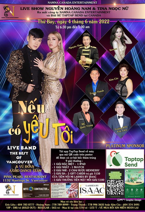 Hoàng Nam & Tina: Hoàng Nam & Tina Ngọc Nữ thân gửi lời chào tới quý đồng hương Việt Nam trong và ngoài nước. Hoàng Nam & Tina hiện đang sinh sống tại Vancouver Canada. Ngoài công việc ca hát thì Hoàng Nam & Tina còn có 1 tiệm nối lông mi tại khu West Side Vancouver. Trải qua hơn hai năm vì đại dịch covid hầu như mọi thứ gần như bị đóng băng, hiện tại đời sống văn nghệ tại hải ngoại đang dần hồi phục trở lại bình thường. Các show diễn event cũng đã được mở lại và quý khán thính giả cũng rất háo hức ủng hộ cho các chương trình sau một thời gian dài yên ắng. Thấy được nhu cầu thưởng thức văn nghệ và mong muốn có thêm những cơ hội gặp mặt chia sẻ tâm tình của quý đồng hương Việt Nam sau đại dịch. Công ty NamNa Canada Entertainment và nhà tổ chức Eric Liêu đã cho ra mắt Liveshow Nguyễn Hoàng Nam & Tina Ngọc Nữ tại Vancouver mang chủ đề “Nếu có yêu tôi ” vào lúc 8pm thứ bảy ngày 4 tháng 6 năm 2022 tại Pink Pearl Restaurant. Cùng trình diễn với chúng tôi trong đêm Liveshow là các ca sĩ khách mời được yêu mến tại Vancouver như: ca sĩ nhạc trẻ sôi động Serena , ca sĩ trữ tình bolero Nguyên Thảo , ca sĩ trữ tình sâu lắng Bích Lan , cặp song ca được yêu mến Trọng Thành – Kim Cúc, MC duyên dáng Quốc Trung, cùng vũ đoàn sôi động A.God Dance Team