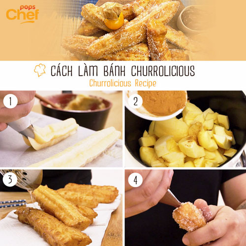Bánh Churrolicious không còn xa lạ với các fan mê đồ ngọt. POPS Chef sẽ mang đến cho bạn cách làm món bánh nổi tiếng này chỉ với 3 bước. Đầu tiên là bước làm bột bánh churro từ các nguyên liệu bột, đường, trứng và nặn các hình sợi dài. Tiếp đến, bạn bắt đầu làm mứt trái cây, bước này sẽ giúp “thanh lý” các loại quả đã trú ngụ quá lâu trong tủ lạnh. Và cuối cùng là bước chiên ngập dầu cho bánh churro ở 180 độ và phủ đường lên bánh. Dùng 1 ống hút và tạo lỗ bên trong bánh để cho nhân sô-cô-la và mứt trái cây vào.