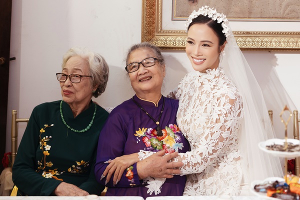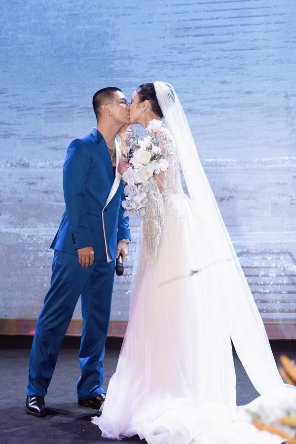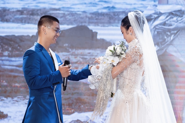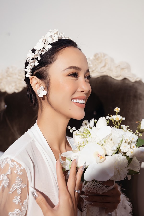Trên lễ đường, cô dâu xuất hiện trong hình ảnh lộng lẫy với chân váy xoè A nhẹ nhàng cùng phụ kiện voan lấp lánh được thiết kế riêng tạo nên hình tượng cô dâu xinh đẹp, lôi cuốn. Và khi tháo phần chân rời, xuất hiện trong phần đặc biệt riêng trong lễ cưới, Ngọc Anh lập tức trở thành 1 cô dâu gợi cảm, trẻ trung và phóng khoáng trong thiết kế ngắn gợi cảm với điểm nhấn ở phần đuôi dài, tựa nàng Tinkle Bell trong truyện thần tiên…
