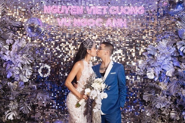 Phòng tiệc cưới còn đặc biệt hơn với gần 100 bàn tiệc thực sự trở thành một show diễn để cô dâu-chú rể tỏa sáng. Có một sự khác biệt rất lớn so với đám hỏi chính là không sử dụng hoa, Vũ Ngọc Anh và ekip muốn sử dụng toàn bộ là các loại lá cây nhiệt đới thông qua xử lý màu để tạo hiệu ứng disco.