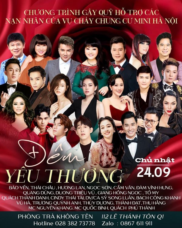 Vào ngày 24.9.2023, show diễn phòng trà Không Tên “Đêm yêu thương” sẽ diễn ra với sự góp mặt của nhiều nghệ sĩ đình đám làng giải trí Việt như: danh ca Bảo Yến, Thái Châu, Hương Lan, Ngọc Sơn, Cẩm Vân, ca sĩ Đàm Vĩnh Hưng, Quang Dũng, Dương Triệu Vũ, Giang Hồng Ngọc, Tố My, Quách Thành Danh, Cindy Thái Tài, Song Luân, Bạch Công Khanh, Vũ Hà, Trương Quỳnh Anh, Thuỳ Dương, Thành Đạt, Thu Hằng, MC Nguyên Khang, MC Quốc Bình, Quách Phú Thành.