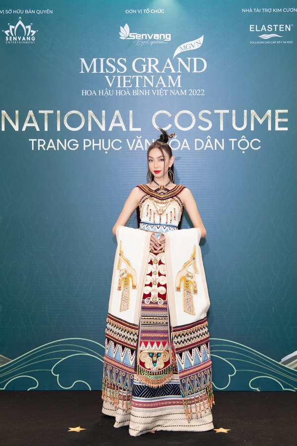Miss Grand International 2021 Nguyễn Thúc Thùy Tiên diện trên mình bộ quốc phục vô cùng hoành tráng với những chi tiết hoa văn thổ cẩm, chim hạc đậm chất dân tộc Việt kết hợp cùng phụ kiện hoa tai tròn mang điểm nhấn hiện đại.