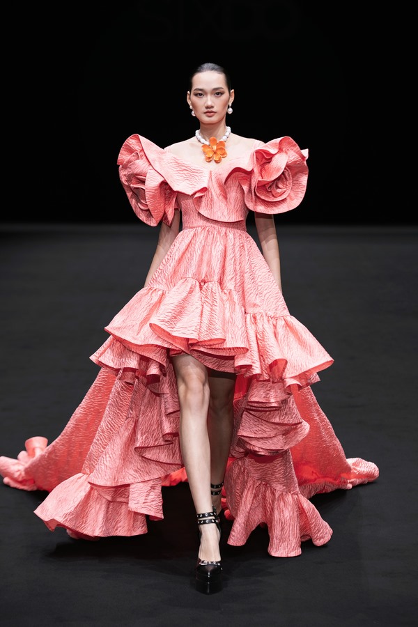 Hoa hậu Khánh Vân, hoa hậu Ngọc Châu, siêu mẫu Minh Tú, á hậu Vũ Thuý Quỳnh, á hậu Quỳnh Anh, người đẹp Hà Kino đều trình diễn 2 thiết kế trong BST. Càng về cuối các thiết kế càng ấn tượng, đôi khi gây khó cho người trình diễn nhưng họ đều có những sải bước ấn tượng chinh phục công chúng.