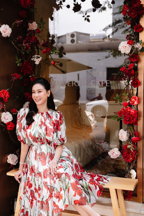 Cựu siêu mẫu Vũ Cẩm Nhung kết hợp áo hoạ tiết hoa cùng chân váy bất đối xứng trông nữ tính, thanh lịch, sang trọng. Trang phục gần như phù hợp với mọi không gian, từ tiệc tùng đến nơi công sở hay dạo phố. Đỗ Mạnh Cường luôn phát huy tối đa tính ứng dụng của các thiết kế giúp người mặc toả sáng ở mọi nơi.
