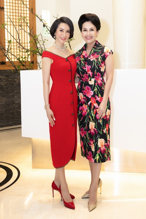 Diva Hồng Nhung trông ngọt ngào với đầm hoạ tiết hoa hồng màu pastel trên nền đen. Chị vui vẻ khi được hội ngộ Thanh Mai. Nữ MC chọn thiết kế màu đỏ có phom ôm sát cơ thể cùng phần cổ sâu trông rất gợi cảm.