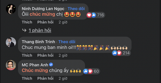 Nhiều nghệ sĩ Việt Nam như Đông Nhi, Minh Tú, Lý Nhã Kỳ, Bảo Anh, Quốc Trường, Thuận Nguyễn, Minh Tú, Gil Lê, Ninh Dương Lan Ngọc … để lại bình luận chúc mừng Minh Hằng khi biết tin cô sắp kết hôn.
