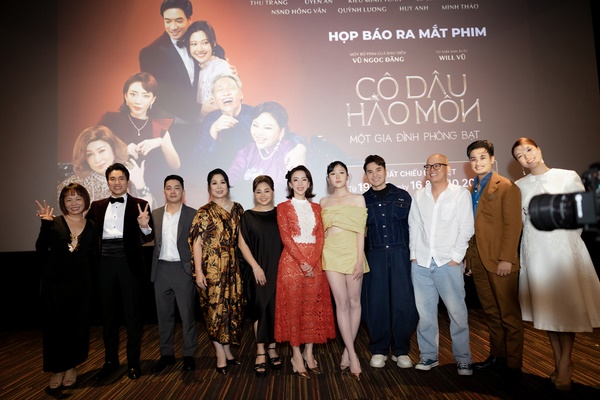 Backdrop trên thảm đỏ của buổi ra mắt còn gây chú ý bởi đạo cụ chiếc ghế nhựa sơ sài lạc lõng trước dàn sao lộng lẫy và hào nhoáng. Như trailer đã gợi ý về một gia đình “phông bạt”, Cô Dâu Hào Môn không chỉ là câu chuyện về làm dâu nhà hào môn, sự khác biệt giàu nghèo mà còn là lối sống phông bạt giả tạo. Cặp mẹ con “kệch cỡm nhất màn ảnh Việt” là NSND Hồng Vân và Quỳnh Lương cũng là một ẩn số thú vị trong phim, nằm giữa vẻ giàu sang quý phái của gia đình mẹ con Thu Trang-Samuel An và gia đình “phông bạt” thoát nghèo Kiều Minh Tuấn, Lê Giang và Uyển Ân.
