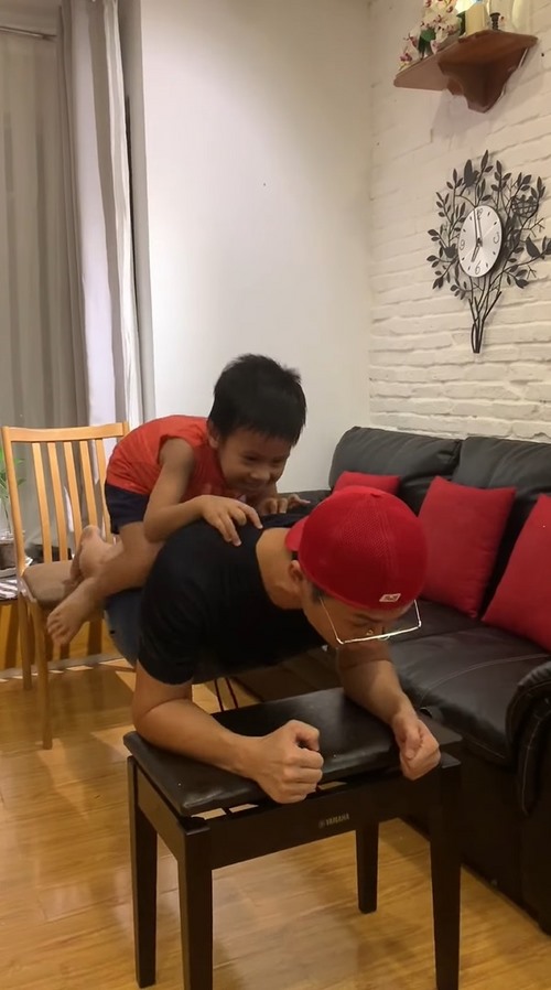 Mặc dù ở nhà nhưng ca sĩ Thiên Vương MTV vẫn chăm chỉ luyện tập hàng ngày nên có vẻ thử thách Run From Home không hề làm khó được anh chàng. Để khiến bài tập thêm kịch tính, Thiên Vương đã thể hiện bản hit Trốn Tìm kiêm cả phần đọc rap. Tuy vậy, thử thách thật sự đối với Thiên Vương là hai bé cưng liên tục quậy phá bố, khiến cho bài plank thêm sức nặng gấp đôi nhưng cũng vui hết mức.