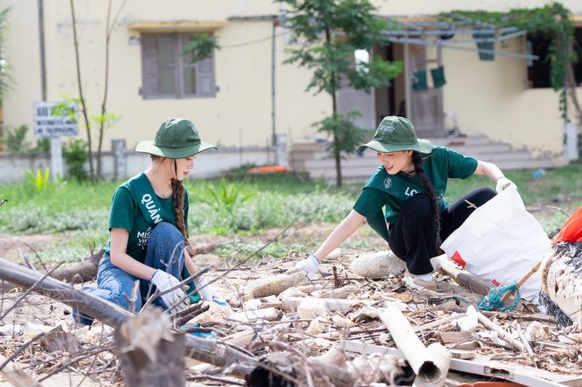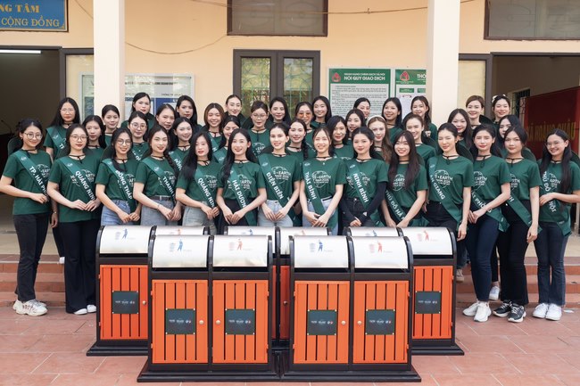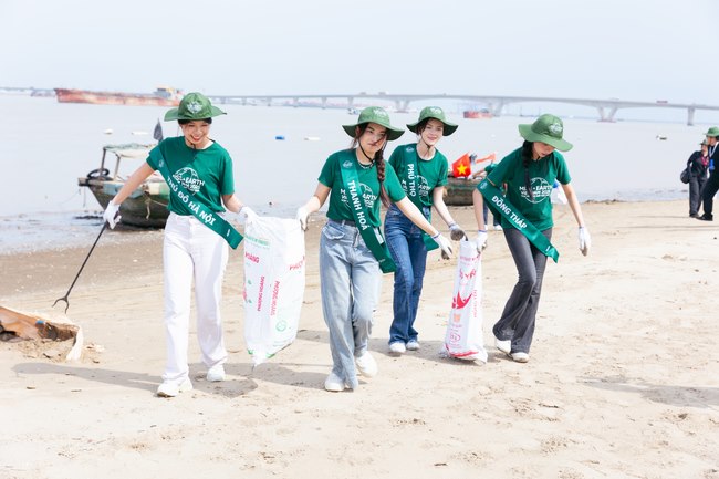 Giữa cái nắng buổi sáng tại bãi biển Hoàng Châu (Cát Hải, Hải Phòng), Top 46 thí sinh Hoa hậu Trái Đất Việt Nam (Miss Earth Vietnam) 2025 xắn tay áo, đeo bao tay và cùng các tình nguyện viên nhặt từng mảnh rác trên bãi cát.